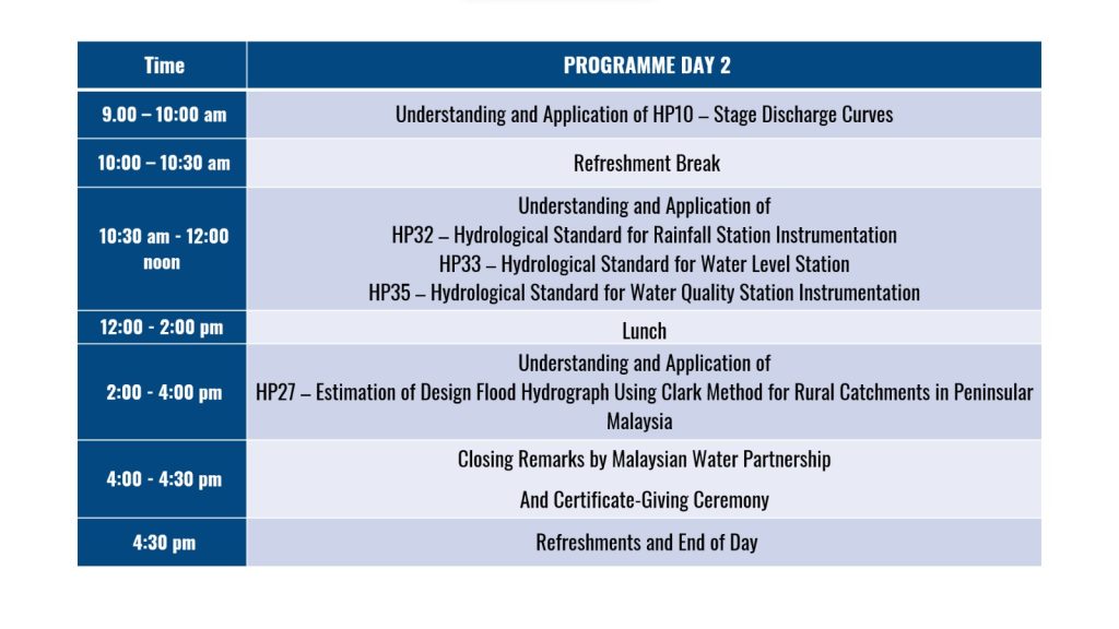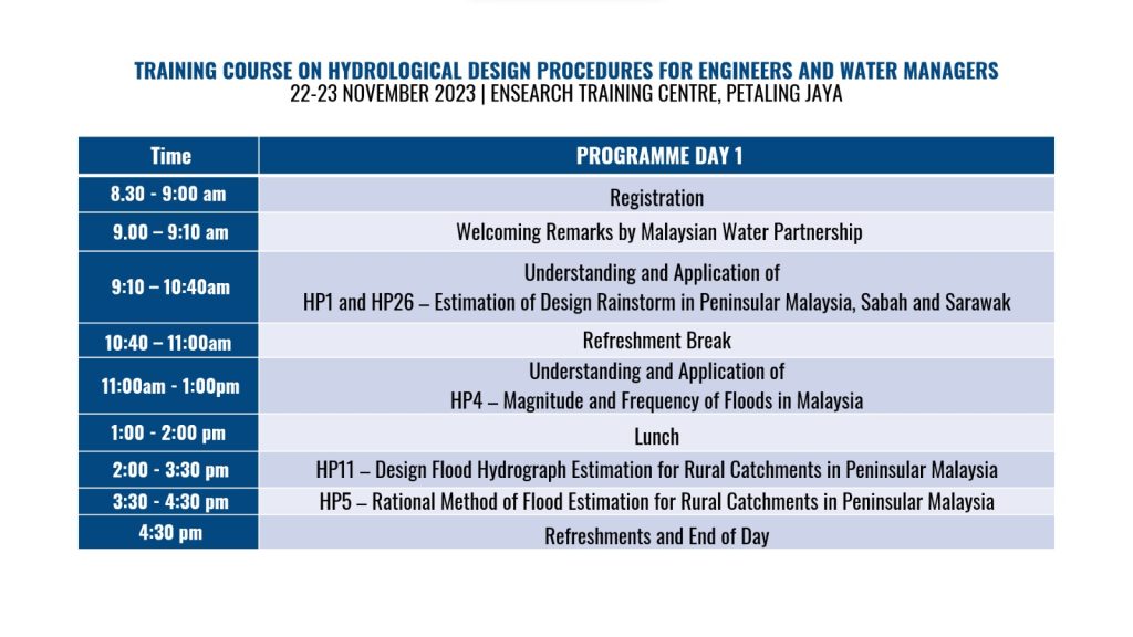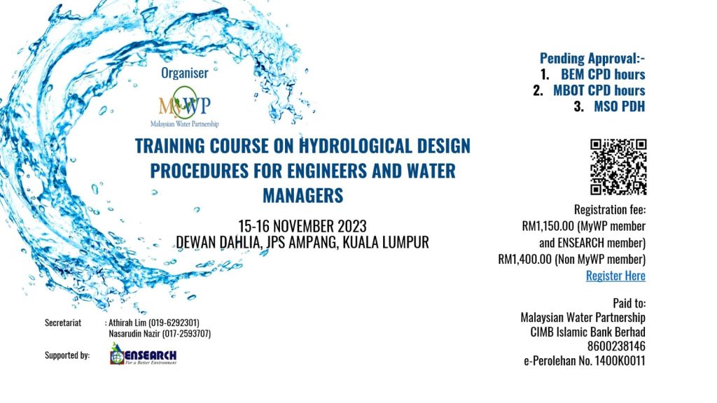 The Malaysian Water Partnership in collaboration with Department of Irrigation and Drainage (DID) Malaysia, and supported by ENSEARCH is pleased to invite you to the Training Course on Hydrological Design Procedures for Engineers and Water Managers.
